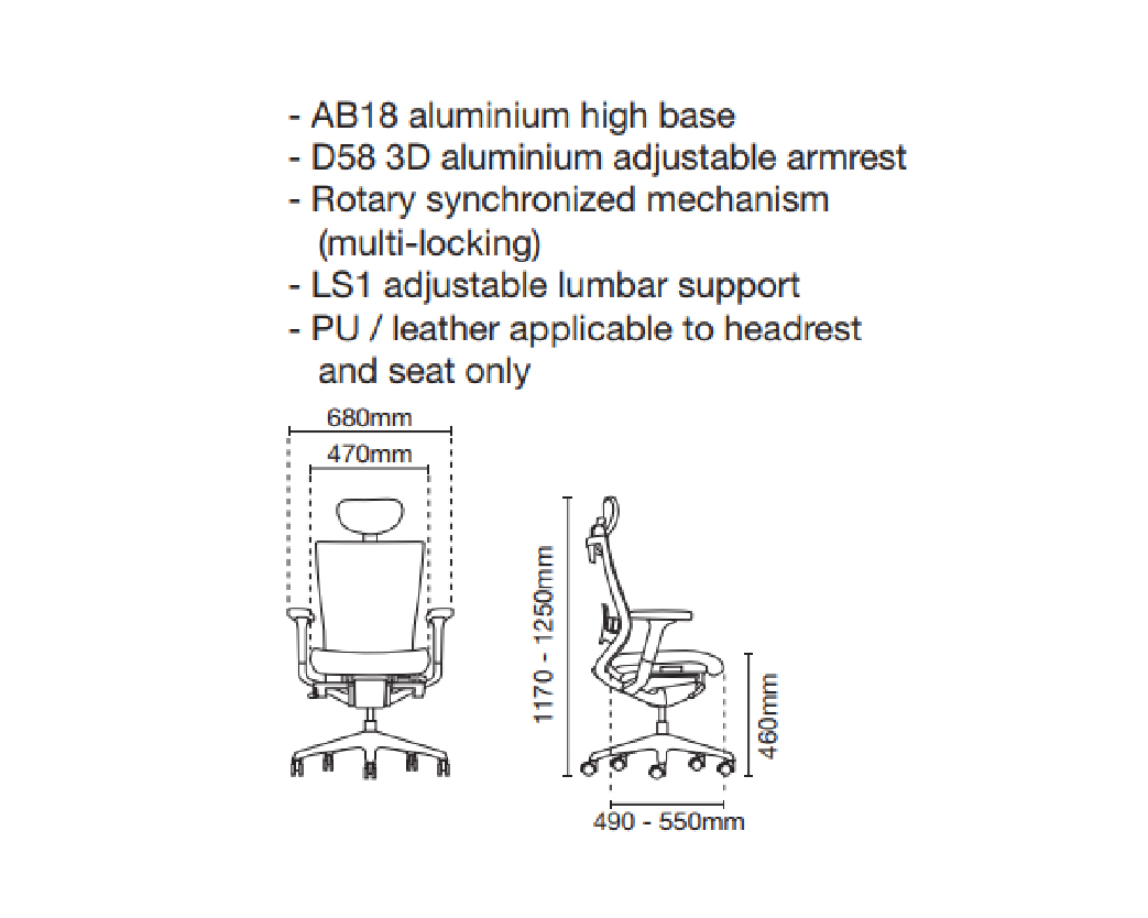 - AB18 aluminium high base - D58 3D aluminium adjustable armrest - Rotary synchronized mechanism (multi-locking) - LS1 adjustable lumbar support - PU / leather applicable to headrest and seat only
