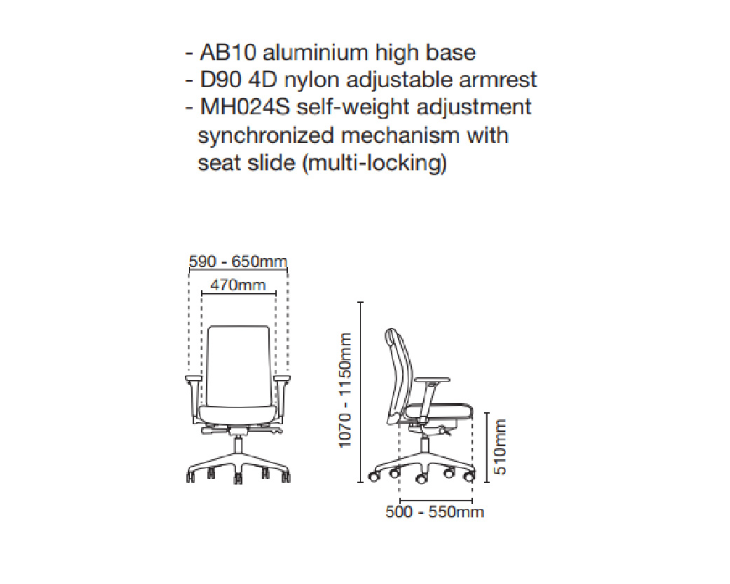 - AB10 aluminium high base - D90 4D nylon adjustable armrest - MH024S self-weight adjustment synchronized mechanism with seat slide (multi-locking)