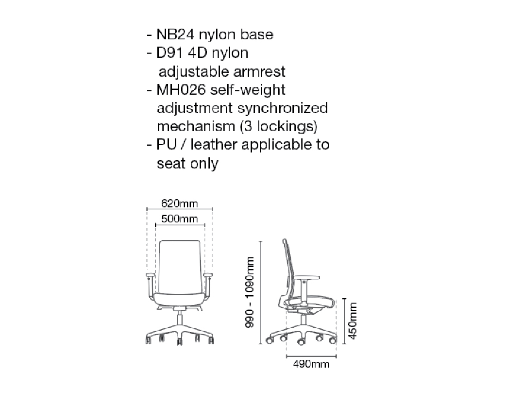 - NB24 nylon base - D91 4D nylon adjustable armrest - MH026 self-weight adjustment synchronized mechanism (3 lockings) - PU / leather applicable to seat only